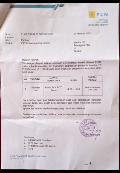 Dengan Hormat, sehubungan dengan adanya pekerjaan pemeliharaan Kubikel di lokasi PLTD maka untuk keselamatan dan keamanan pelaksanaan pekerjaan tersebut, PT. PLN (Persero) ULP Blangkejeren akan melakukan penghentian sementara Aliran Listrik pada Tanggal 02 – Maret – 2023 dilokasi pekerjaan Kantor PLN PLTD Rema sekitar Pukul 14.00 hingga Pukul 16.00 WIB lokasi pemadaman sementara seluruh Gayo Lues.