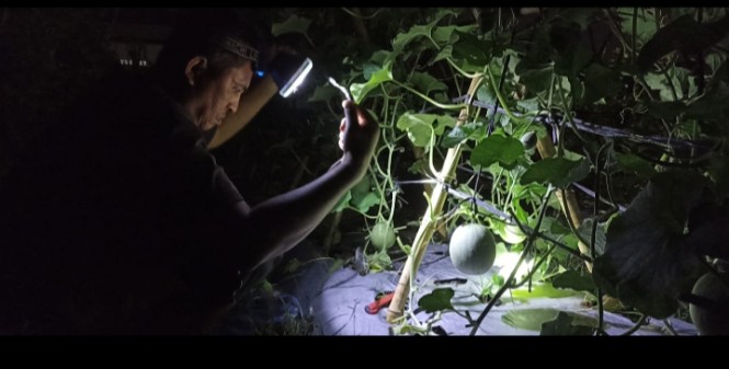 Samsul dalam mengurus kebun melon, dirinya dibantu oleh dua orang rekannya.
