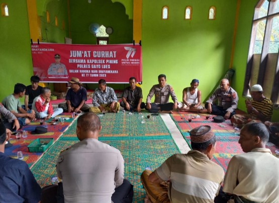 Pining, Oposisi-News,86.Com – Dalam Rangka Hari Bhayangkara ke 77. Jajaran Polsek Pining melakukan kegiatan Jum’at Curhat bertempat di Meunasah Datok Pining, Dusun Benteng Desa Pining Kecamatan Pining Kabupaten Gayo Lues.