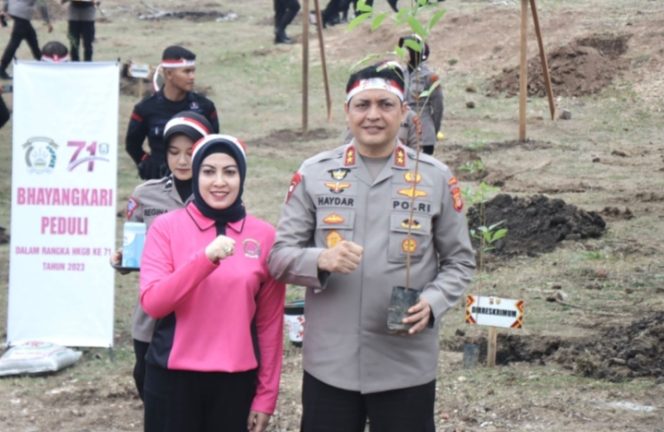 Banda Aceh, Oposisi-News,86.Com — Kapolda Aceh Irjen Ahmad Haydar beserta Ketua Bhayangkari Daerah Aceh Ny. Sissy Ahmad Haydar menanam pohon frutikultur di Puslat Satbrimob Polda Aceh, Lamreh, Kabupaten Aceh Besar, Rabu, 23 Agustus 2023.