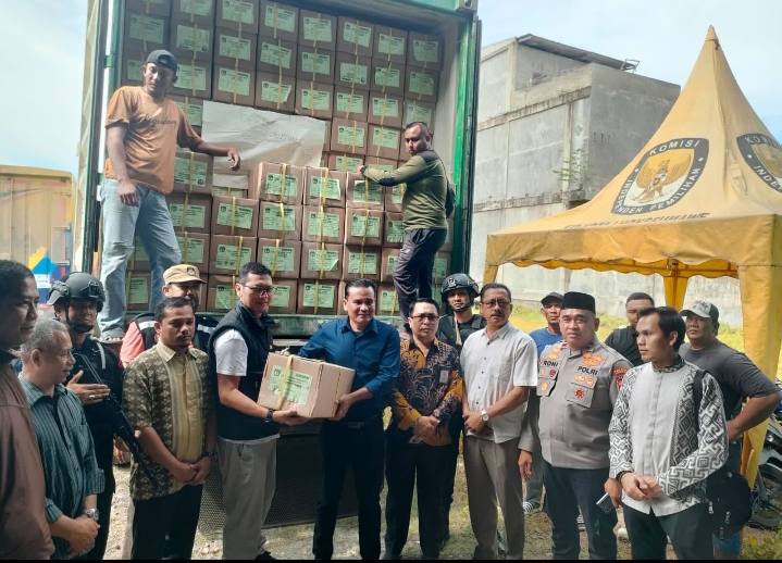 LHOKSEUMAWE – Personel Polres Lhokseumawe melakukan pengamanan serah terima surat suara Pemilu 2024 dari jasa ekspedisi di gudang logistik KIP Lhokseumawe, Jumat (5/1/2024).