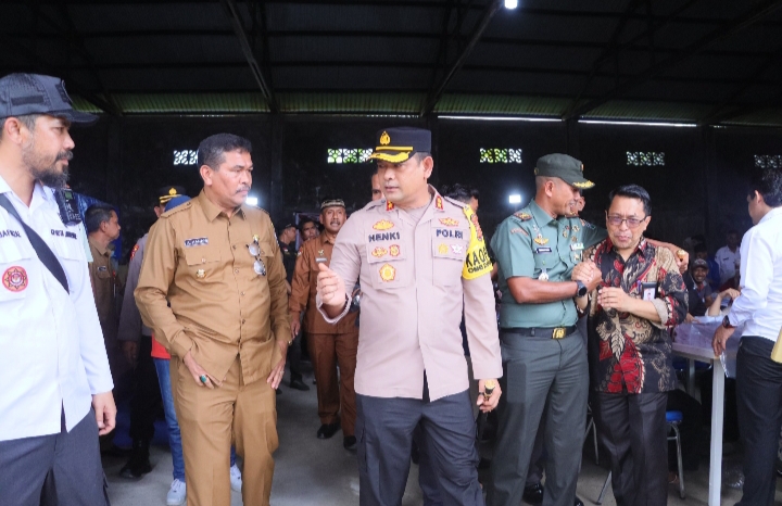 LHOKSEUMAWE – Kapolres Lhokseumawe, AKBP Henki Ismanto bersama unsur Muspida meninjau proses penyortiran dan pelipatan surat suara Pemilu 2024 di gudang logistik KIP Lhokseumawe, Senin (8/1/2024).