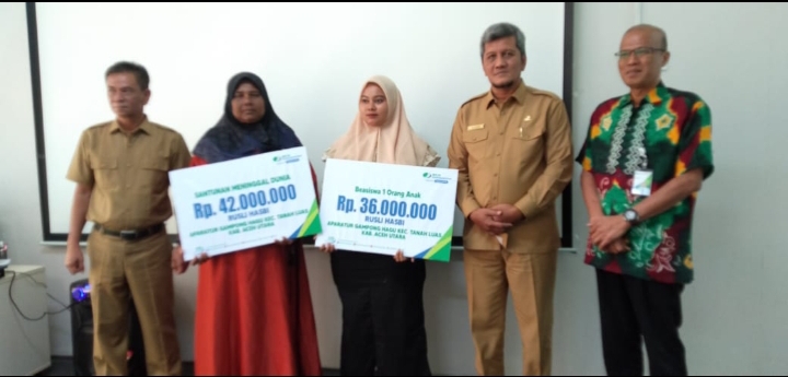 Santunan meninggal dunia sebesar Rp.42 juta per orang, masing-masing diterima oleh ahli waris almarhum Rusli Hasbi yang merupakan aparatur Gampong Hagu Kecamatan Tanah Luas dan ahli waris almarhum Zakaria selaku Tuha Peuet Gampong Keutapang Kecamatan Tanah Pasir. Sementara beasiswa senilai Rp.36 juta diberikan kepada satu orang anak dari almarhum Rusli Hasbi.