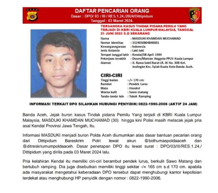 Banda Aceh – Direktorat Tindak Pidana Umum (Dittipidum) Bareskrim Polri mengeluarkan Daftar Pencarian Orang (DPO) Tersangka Kasus Tindak Pidana Pemilu yang terjadi di KBRI Kuala Lumpur Malaysia, Tanggal 21 Juni 2023 s.d. Sekarang.