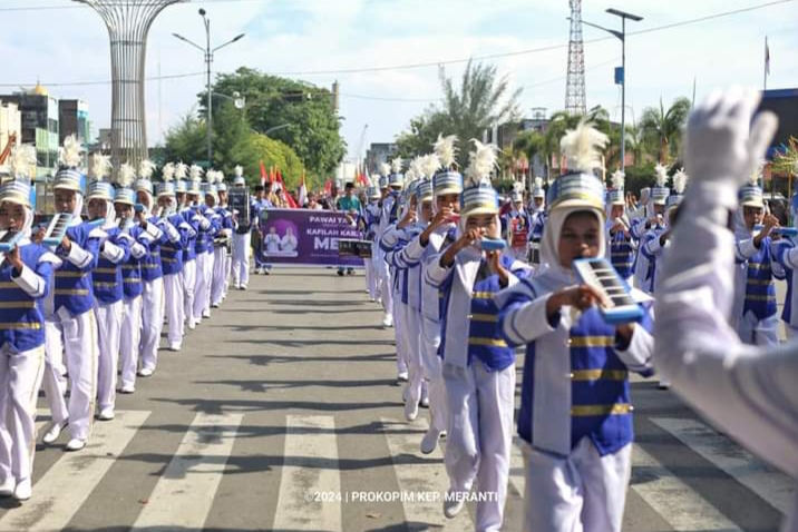 Menempati barisan urutan ke empat dari 12 Kabupaten/Kota, Kafilah Kabupaten Kepulauan Meranti mengikutsertakan lebih dari 600 orang dalam barisan pawai.