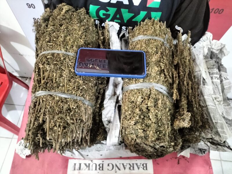 LHOKSUKON – Personel Satuan Reserese Narkoba Polres Aceh Utara mengamankan seorang pria berinisial ES, 42 tahun bersama 2 bal daun ganja kering seberat 2kg di Perempatan Kota Lhoksukon, Jumat (26/4/2024).