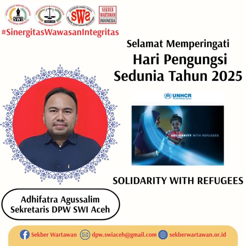 Banda Aceh – Dalam rangka memperingati Hari Pengungsi Sedunia 2025 dengan tema “Solidarity with Refugees”, Dewan Pimpinan Wilayah Sekber Wartawan Indonesia (DPW SWI) Provinsi Aceh melalui Sekretarisnya, Adhifatra Agussalim, CIP, CIAPA, CASP, CPAM, C.EML, menyerukan pentingnya membangun solidaritas konkret dan berkelanjutan bagi para pengungsi. Menurutnya, kelompok rentan ini terus menghadapi berbagai tantangan kemanusiaan yang seringkali luput dari perhatian publik dan kebijakan.