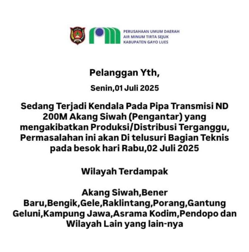 Yth. Pelanggan Perumda Air Minum Tirta Sejuk Kabupaten Gayo Lues.