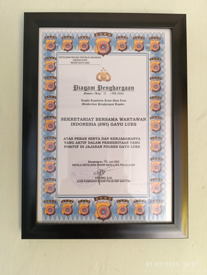 Piagam penghargaan tersebut secara spesifik mengakui peran serta dan kerja sama SWI Gayo Lues dalam menyajikan informasi yang akurat dan membangun citra positif institusi Polri di tengah masyarakat.