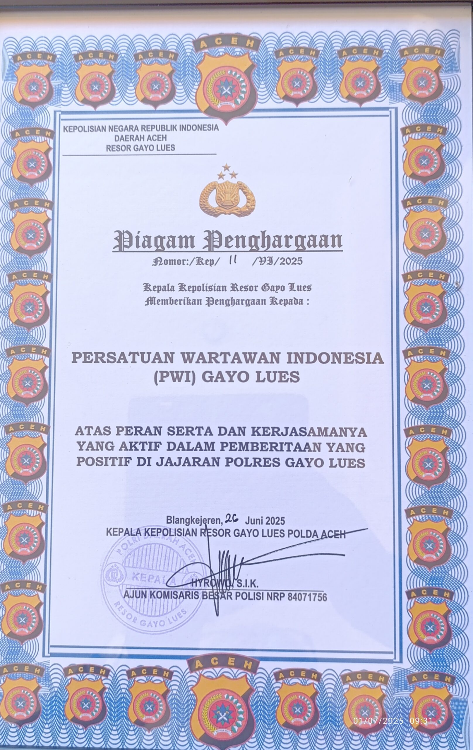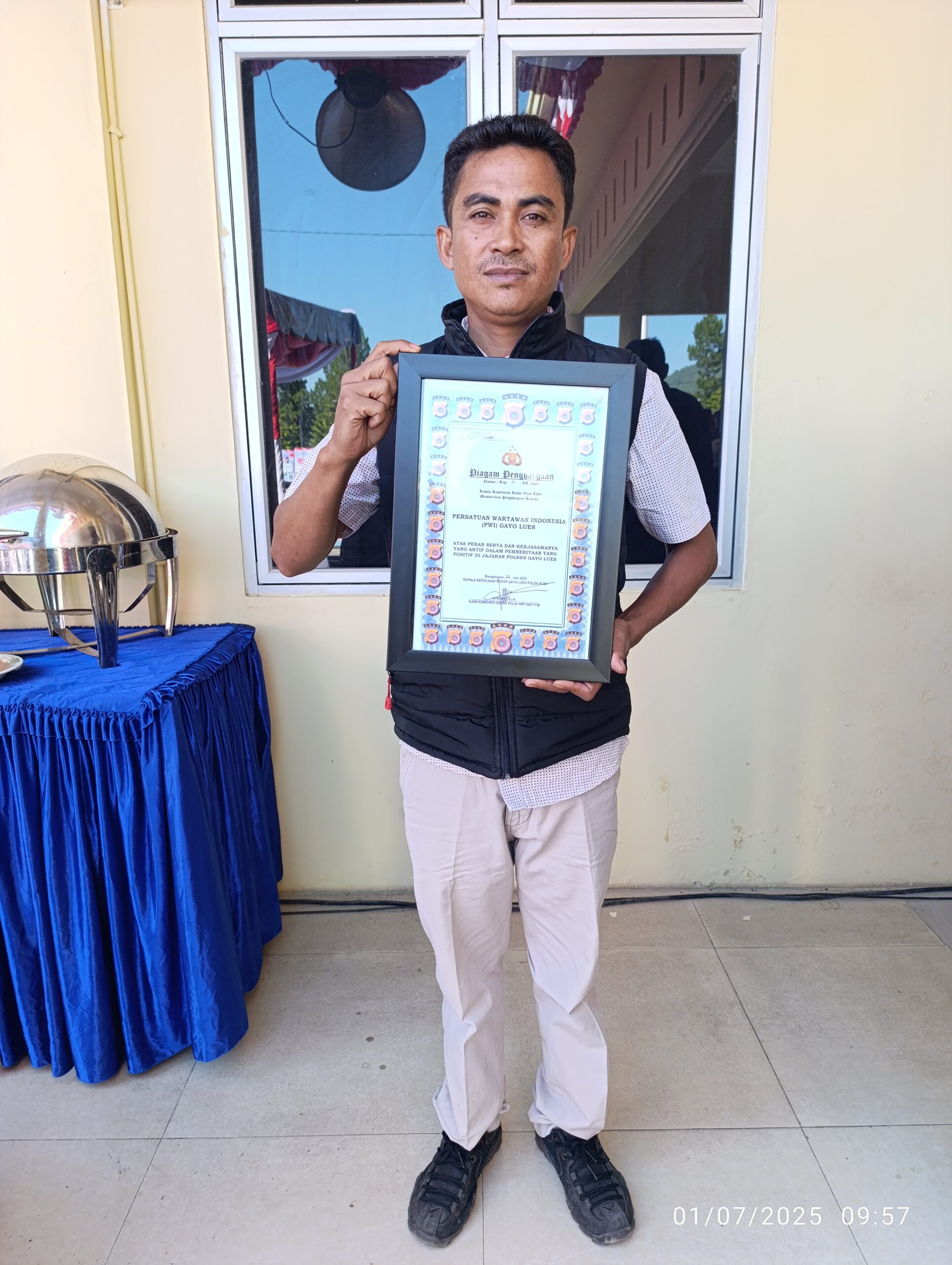 Penghargaan tersebut diberikan langsung oleh Kepala Kepolisian Resor Gayo Lues, AKBP Hyrowo, S.I.K., sebagai bentuk pengakuan atas kontribusi PWI Gayo Lues dalam menyampaikan informasi yang akurat dan membangun citra positif institusi kepolisian di mata masyarakat.