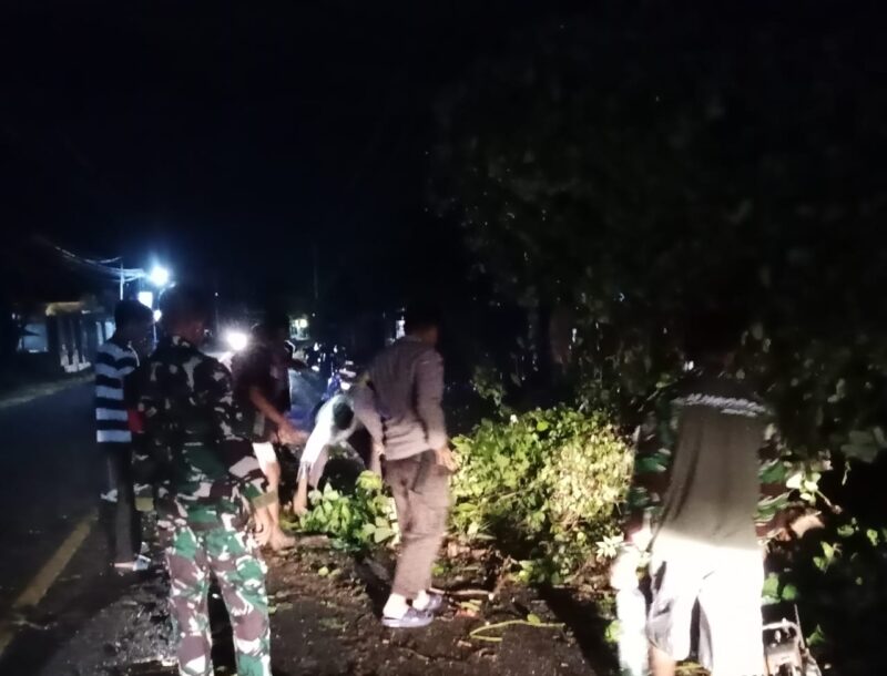Dengan menggunakan alat seadanya dan penerangan terbatas, mereka bersama warga bahu membahu memotong dan membersihkan dahan serta batang pohon yang melintang di jalan. Upaya ini dilakukan untuk memastikan jalur vital tersebut bisa segera dilalui kembali oleh kendaraan.