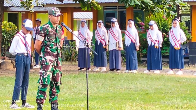 NTB, Sumbawa – Dalam rangka menumbuhkan semangat nasionalisme dan cinta tanah air di kalangan generasi muda, Babinsa Desa Usar, Serda Fahrullah dari Koramil 1607-02/Empang melaksanakan kegiatan upacara bendera sekaligus memberikan materi wawasan kebangsaan kepada siswa-siswi SMPN 7 Plampang, pada Senin (14/07/2025).