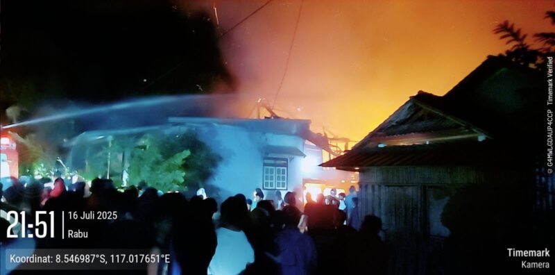 Sumbawa Besar|NTB, — Kebakaran hebat melanda Dusun Marente Beru, Desa Marente, Kecamatan Alas, Kabupaten Sumbawa, pada Rabu malam, 16 Juli 2025. Peristiwa yang terjadi sekitar pukul 21.15 WITA ini menyebabkan dua unit rumah panggung hangus terbakar milik Sdr. HD dan Sdr. A dan dua rumah lainnya rusak ringan milik Sdr. MA dan Sdr. ZA. Kerugian material diperkirakan mencapai Rp210 juta.
