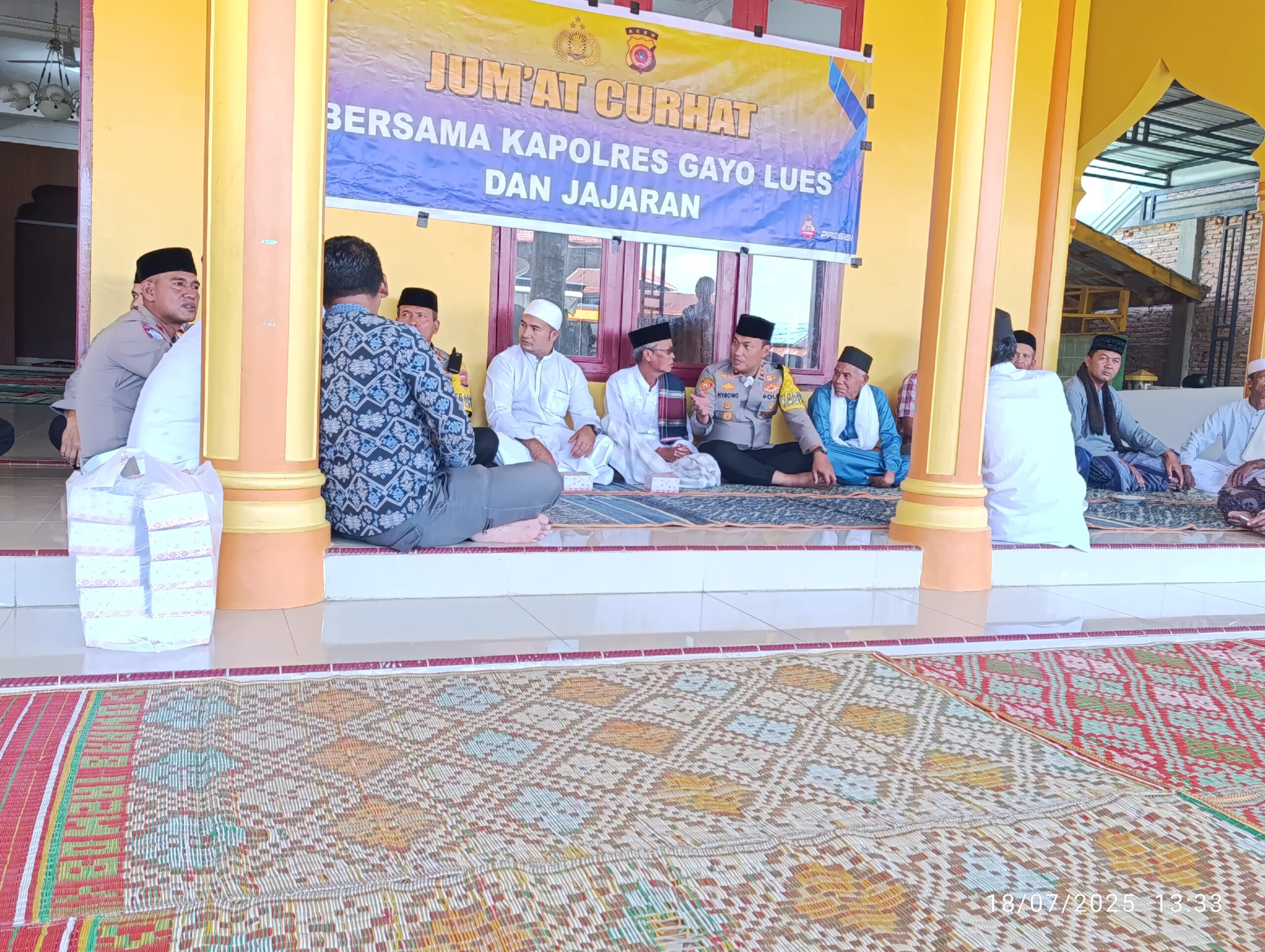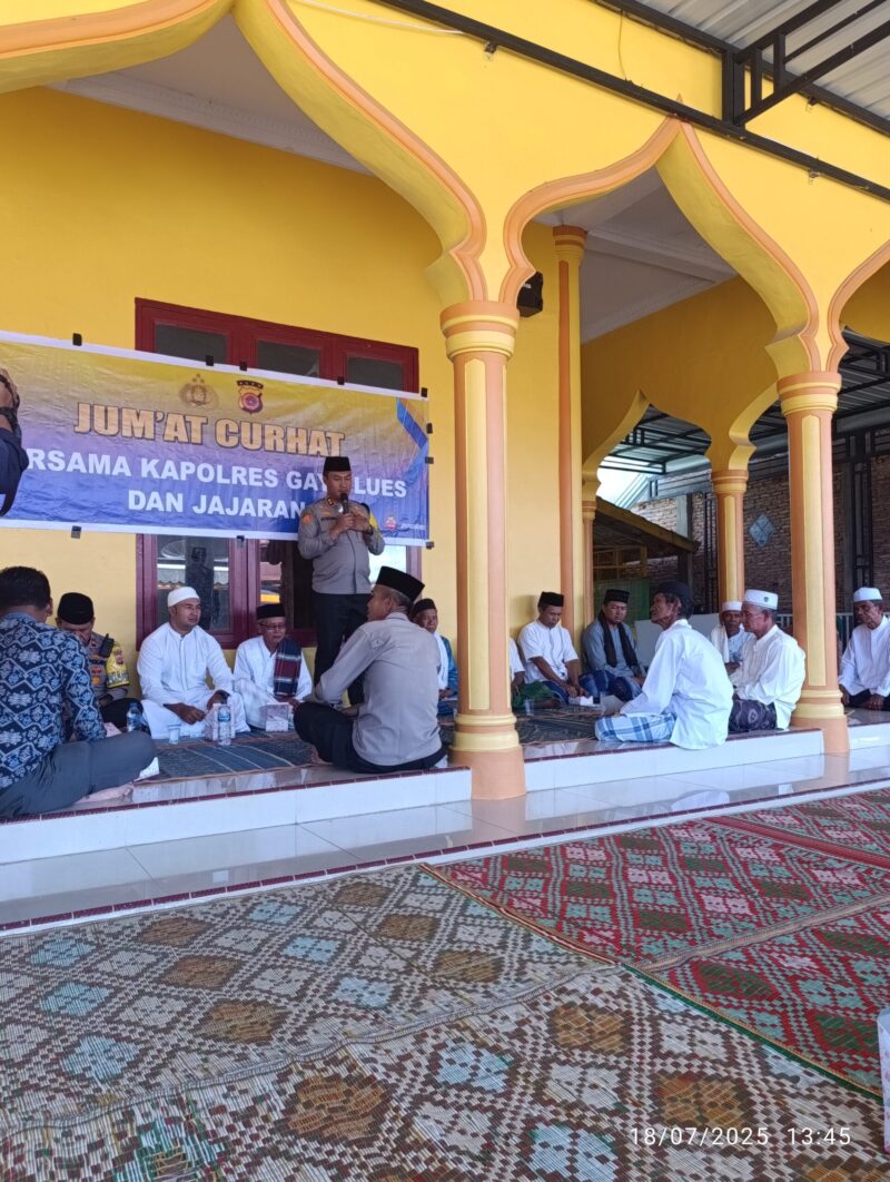 Porang/Gayo Lues – Kapolres Gayo Lues AKBP. Hyrowo SIK, didampingi Wakapolres Kompol. Edi dan para Pejabat Utama, hari ini menggelar program Jumat Curhat di Masjid Jami’ Porang, Jum’at (18/07/2025).