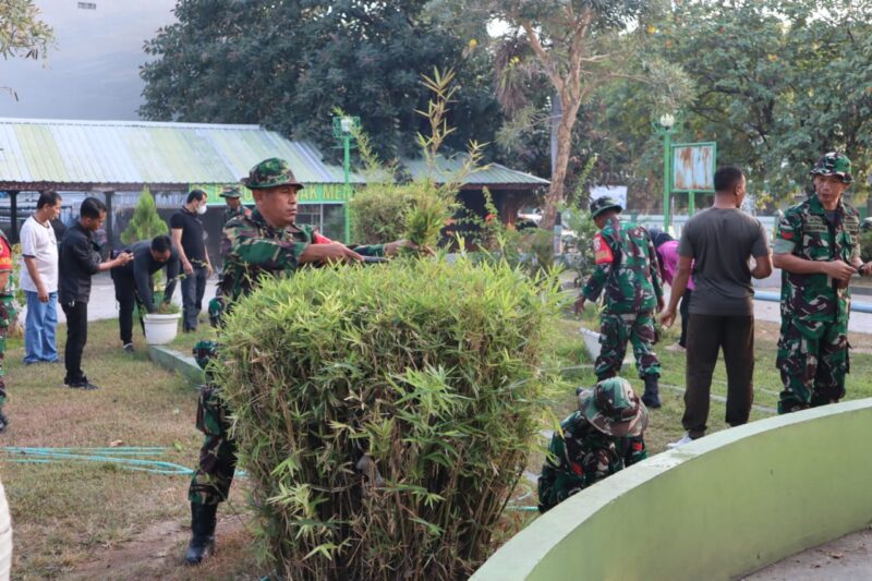 Personel TNI dari Kodim dan Yonif TP 835/SWB bersama masyarakat membersihkan taman, memangkas rumput, dan memperindah kawasan sekitar Makodim agar terlihat asri dan tertata rapi.