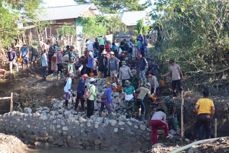 Gotong royong antara TNI dan warga tampak solid di lapangan. Personel Satgas TMMD bersama warga bahu membahu mengangkut batu, mencampur material, hingga pengecoran pondasi jembatan. Semangat kerja kolektif yang ditunjukkan mencerminkan kuatnya kemanunggalan TNI dan rakyat dalam membangun desa.