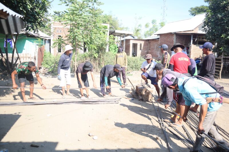 Proses perakitan dilakukan secara gotong royong. Sebagian warga membantu memotong dan menata besi sesuai ukuran, sementara yang lain menyiapkan kawat pengikat dan material pendukung. Suasana kerja penuh kekompakan mencerminkan kemanunggalan TNI dan rakyat.