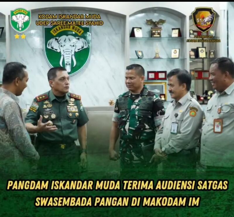 Banda Aceh – Panglima Komando Daerah Militer (Pangdam) Iskandar Muda, Mayor Jenderal TNI Niko Fahrizal, M.Tr.(Han)., mengadakan pertemuan strategis dengan Satuan Tugas (Satgas) Swasembada Pangan di Markas Kodam IM pada Kamis, 14 Agustus 2025. Audiensi ini menandai komitmen kuat TNI dalam mendukung program ketahanan pangan nasional, khususnya di wilayah Aceh.