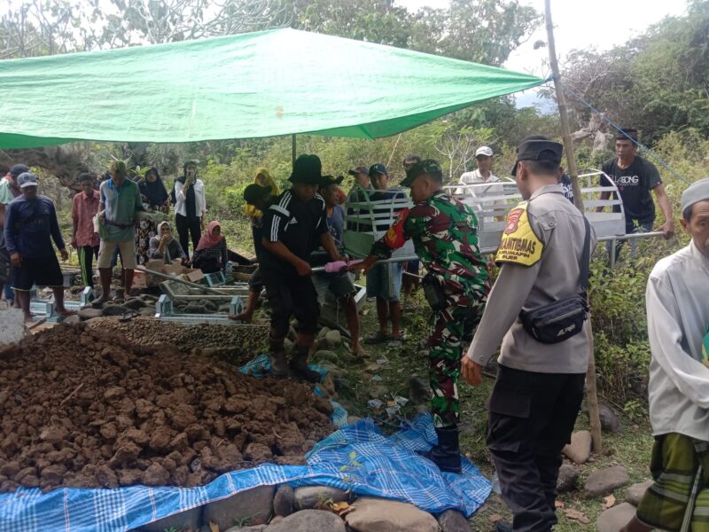 NTB – Sumbawa – Babinsa Desa Jurumapin, Koramil 1607-04/Alas, Serka Yuliadi menghadiri prosesi pemakaman almarhumah Hj. Markia (80 tahun), warga Dusun Jurumapin Bawah, Desa Jurumapin, Kecamatan Buer, yang meninggal dunia akibat musibah kebakaran rumah pada Senin malam (25/8/2025).