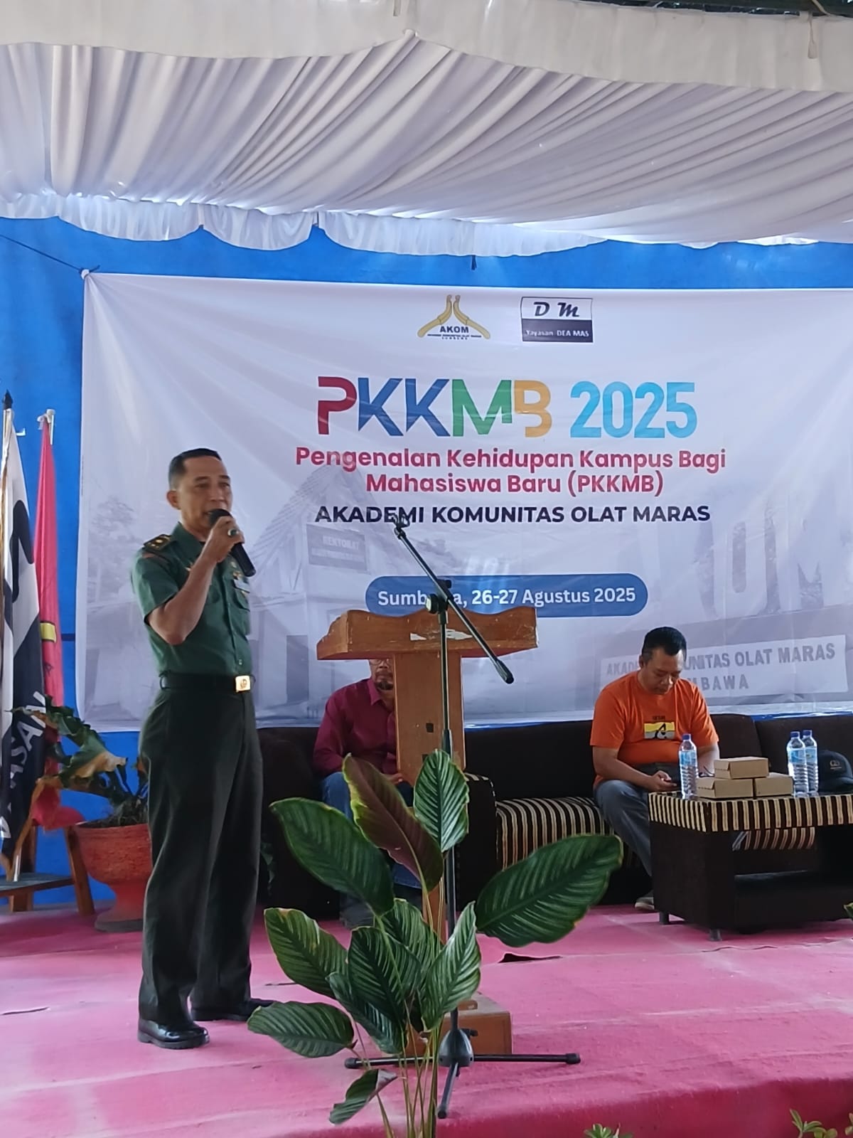 NTB – Sumbawa – Kepala Staf Kodim (Kasdim) 1607/Sumbawa, Mayor Inf Dahlan, S.Sos., melaksanakan kegiatan Pengenalan Kehidupan Kampus Bagi Mahasiswa Baru (PKKMB) Tahun 2025 di Kampus Akademi Komunitas Olat Maras (AKOM) Sumbawa yang berlokasi di Jl. Raya Olat Maras, Dusun Batu Alang, Desa Pernek, Kecamatan Moyo Hulu, Kabupaten Sumbawa, Selasa (26/8/2025).