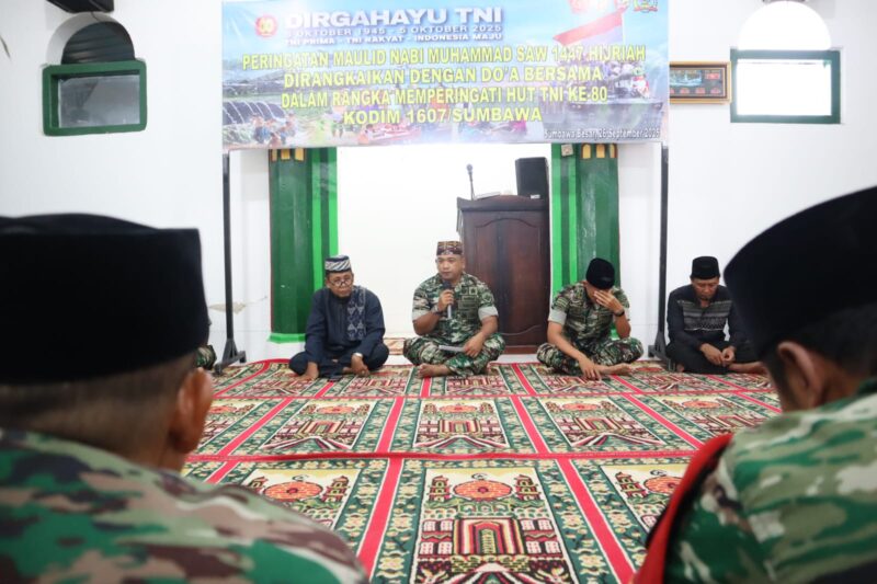 NTB – Sumbawa — Dalam rangka meningkatkan kualitas keimanan dan ketakwaan prajurit sekaligus mempererat silaturahmi, Kodim 1607/Sumbawa menyelenggarakan kegiatan Peringatan Maulid Nabi Muhammad SAW 1447 H yang dirangkaikan dengan doa bersama menyambut HUT TNI ke-80. Kegiatan ini berlangsung khidmat di Musholla Abul Khoir Makodim 1607/Sumbawa, Jumat (26/09/2025).