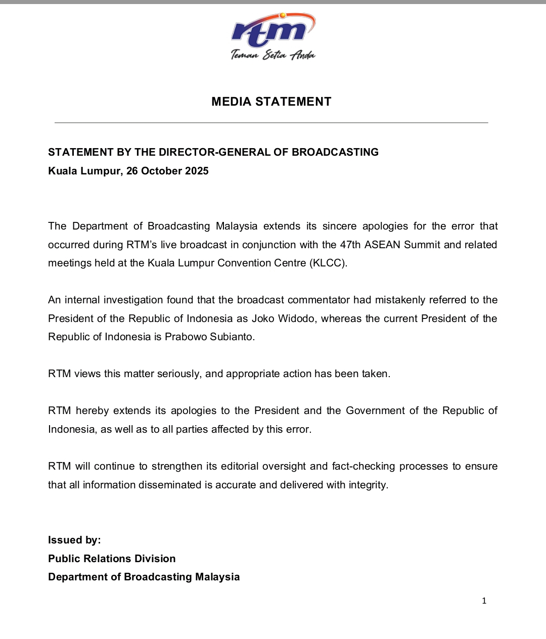 Kuala Lumpur/Malaysia — Radio Televisyen Malaysia (RTM), lembaga penyiaran publik negeri jiran, tersandung skandal minor yang memalukan di panggung internasional. Dalam siaran langsung Konferensi Tingkat Tinggi (KTT) ke-47 ASEAN di Kuala Lumpur, Minggu, 26 Oktober 2025, pengulas siaran mereka secara keliru menyebut nama Presiden Republik Indonesia (RI) sebagai Joko Widodo.