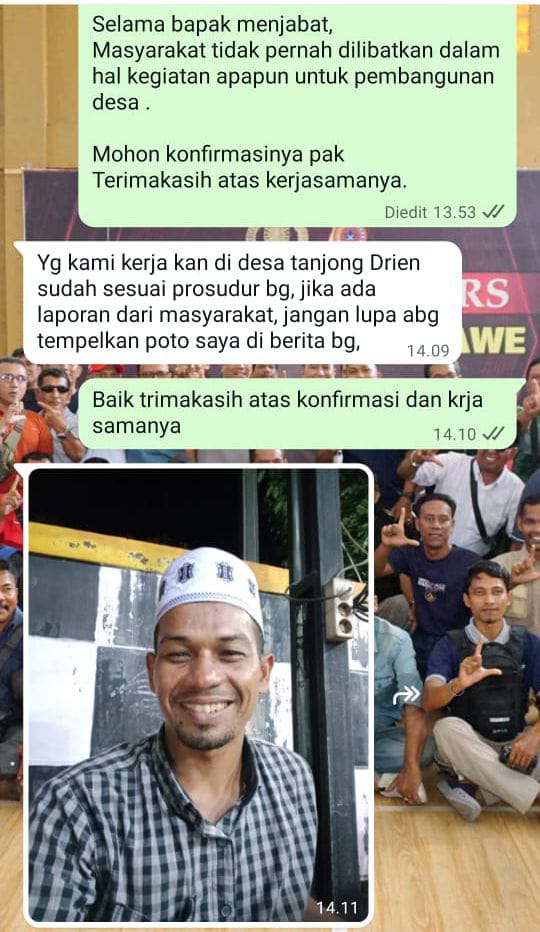 Upaya wartawan untuk meminta klarifikasi kepada Geuchik Tanjong Drein justru berujung pada pernyataan mengejutkan. Melalui pesan WhatsApp , sang geuchik, Abubakar, dengan nada menantang mengatakan: yang kami kerjakan di desa Tanjong Drien sudah sesuai prosedur bang, jika ada laporan dari masyarakat jangan lupa, Abang tempel photo saya diberita bang.