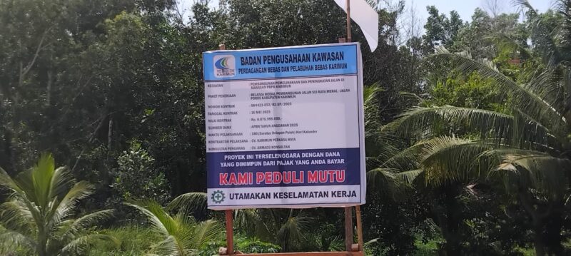 Di atas kertas, proyek ini tampak mentereng. Papan nama proyek mencantumkan paket pekerjaan: “Belanja Modal Pembangunan Sei Raya Meral ke Jalan Poros”. Nilai kontrak yang digelontorkan dari APBN 2025 pun tak main-main: Rp 8.876.985.000. Proyek ini dieksekusi oleh CV. Karimun Perkasa Raya sebagai kontraktor pelaksana, dan diawasi oleh CV. Armaco Konsultan.