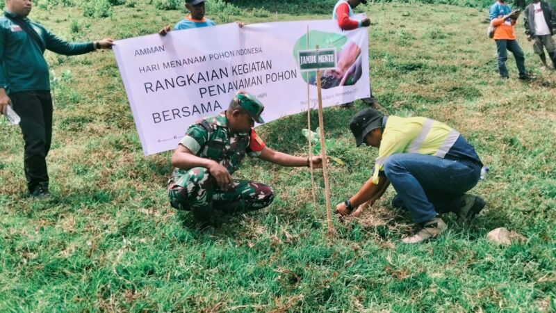 Selain Babinsa dan kelompok tani, kegiatan juga dihadiri perwakilan dari PT AMMAN, perangkat desa, serta masyarakat sekitar yang turut berpartisipasi menanam berbagai jenis bibit pohon.