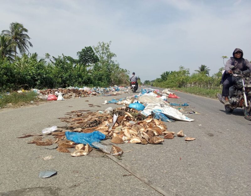 Aceh Utara — Tumpukan sampah hampir menutup total badan jalan di jalur line pipa yang menghubungkan Desa Sumbok Rayek dan Desa Tupin Jok, Kecamatan Nibong, Kabupaten Aceh Utara, Kamis, 22 Januari 2025.