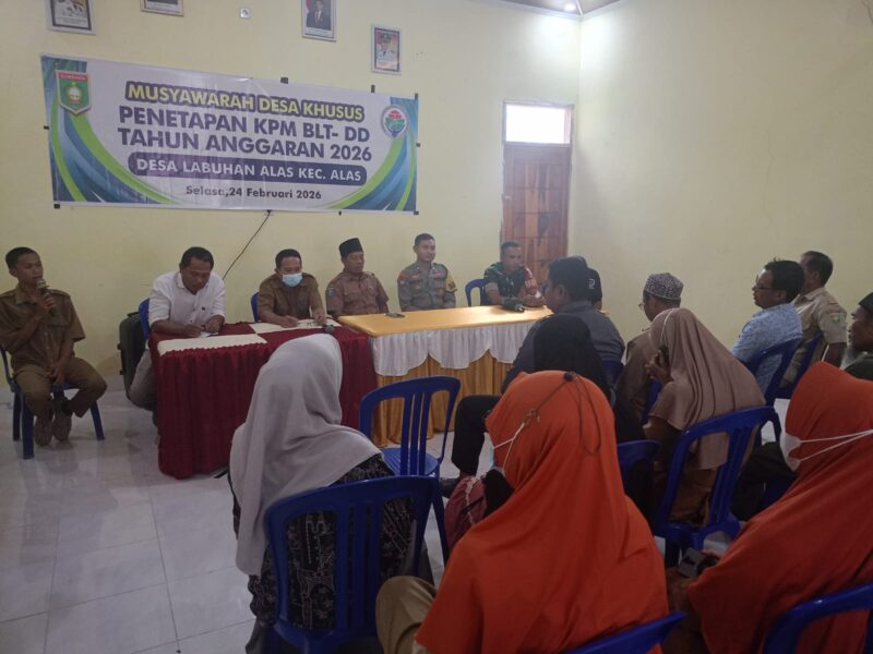 Alas, Sumbawa – Babinsa Desa Labuhan Alas Koramil 1607-04/Alas, Serda Andriano, menghadiri kegiatan rapat Musyawarah Desa Khusus (Musdesus) dalam rangka penetapan Keluarga Penerima Manfaat (KPM) Bantuan Langsung Tunai Dana Desa (BLT-DD) Tahun Anggaran 2026. Kegiatan tersebut berlangsung di Aula Kantor Desa Labuhan Alas, Kecamatan Alas, Kabupaten Sumbawa, pada Selasa (24/2/2026).