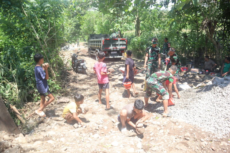 Kegiatan gotong royong ini menjadi wujud nyata kebersamaan antara TNI dan masyarakat dalam mendukung percepatan pembangunan infrastruktur di wilayah tersebut. Dengan penuh semangat, warga dari berbagai kalangan turut ambil bagian, mulai dari orang tua hingga anak-anak, bahu-membahu membersihkan dan merapikan akses jalan agar memudahkan mobilitas selama proses pembangunan berlangsung.