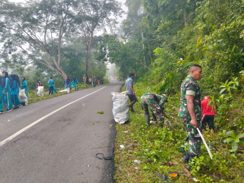 Dengan penuh semangat, personel Koramil bersama warga membersihkan sepanjang ruas jalan, memastikan akses transportasi kembali lancar dan aman bagi pengguna jalan. Keterlibatan aktif TNI ini menjadi wujud nyata kemanunggalan TNI dengan rakyat, sekaligus memperkuat sinergi antara aparat dan masyarakat dalam menjaga lingkungan.